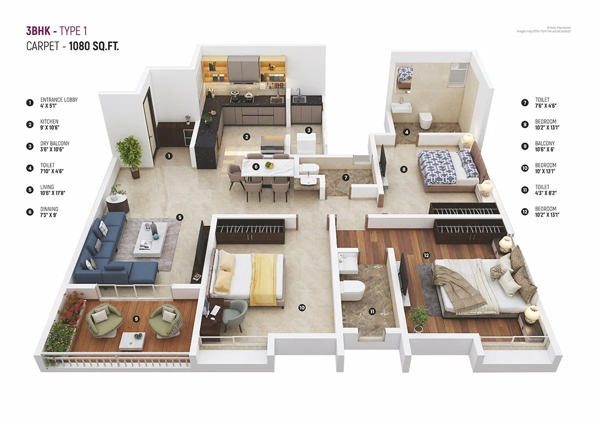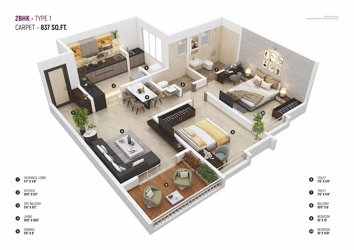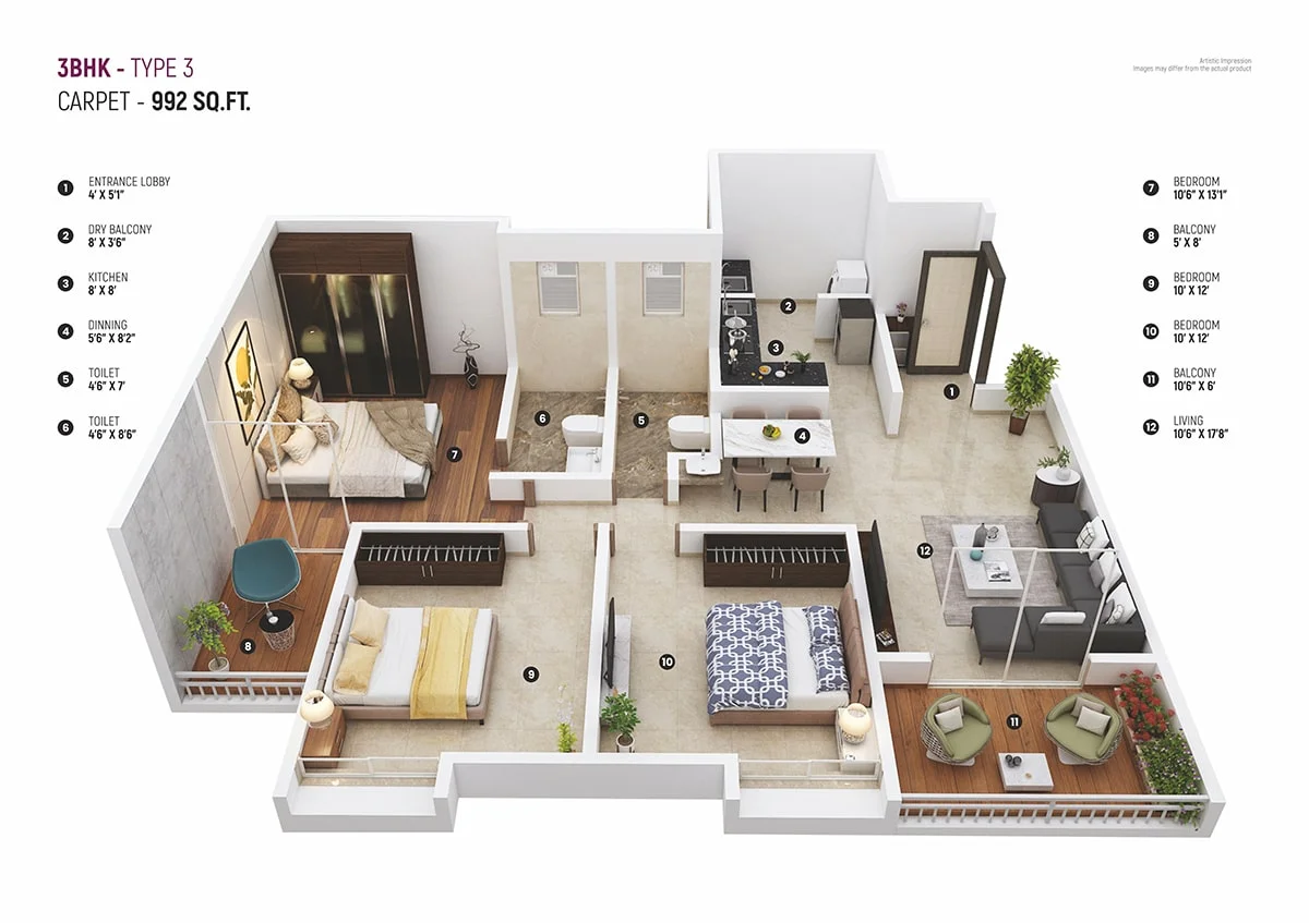 - Provision for water purifier, utilities and washing machine in dry balcony